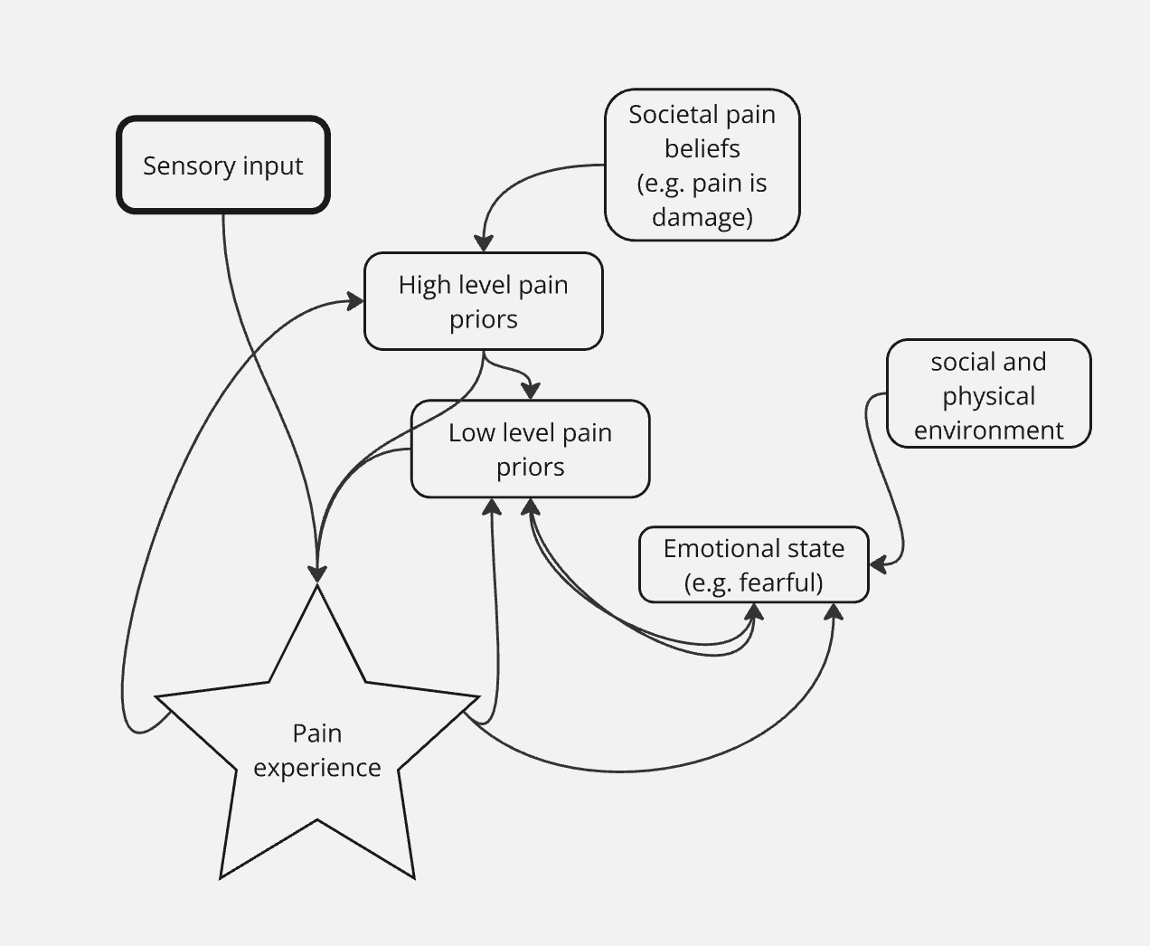 Hechler, Tanja, Dominik Endres, and Anna Thorwart. “Why harmless sensations might hurt in individuals with chronic pain: about heightened prediction and perception of pain in the mind.” Frontiers in psychology 7 (2016): 1638.; Büchel, Christian, et al. “Placebo analgesia: a predictive coding perspective.” Neuron 81.6 (2014): 1223-1239.; Stilwell, Peter, and Katherine Harman. “An enactive approach to pain: beyond the biopsychosocial model.” Phenomenology and the Cognitive Sciences 18.4 (2019): 637-665.; Ashar, Yoni K., et al. “Effect of pain reprocessing therapy vs placebo and usual care for patients with chronic back pain: a randomized clinical trial.” JAMA psychiatry 79.1 (2022): 13-23.